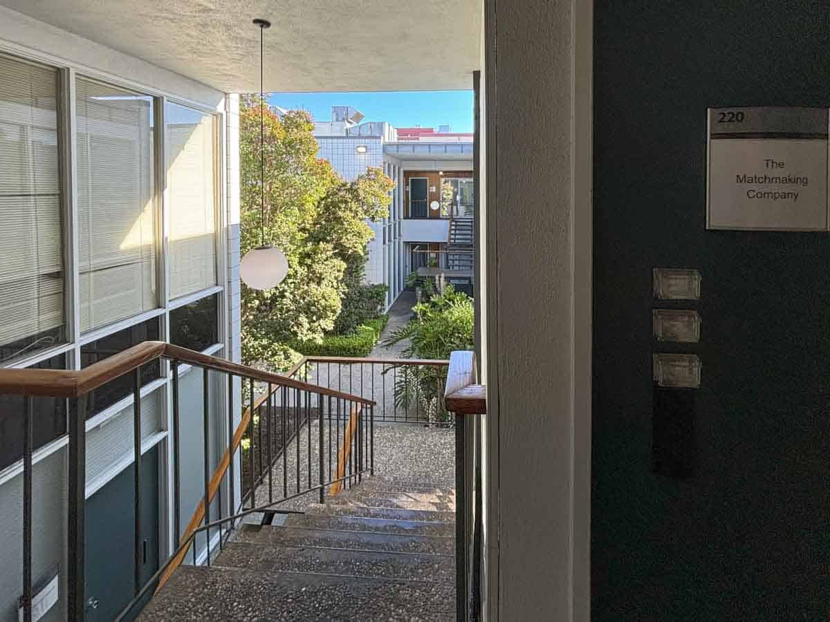 - Walk into the courtyard between the two white buildings, and we are up the 2nd stairs on your right.